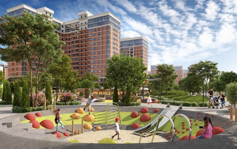 Так же во дворах будет располагаться несколько спортивных и детских площадок, множество прогулочных дорожек с лавочками и зонами отдыха, собственная коммерческая инфраструктура (в небольших зданиях смогут разместиться магазины, ателье, а также офисы других компаний).